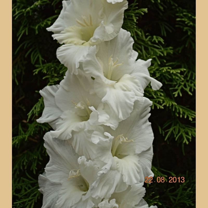 Гладиолус "Первый Снежок" прекрасно подходит для срезки и создания букетов, благодаря своим крупным и плотным соцветиям. Цветение начинается в середине лета и продолжается до начала осени, радуя вас своей красотой на протяжении нескольких недель.